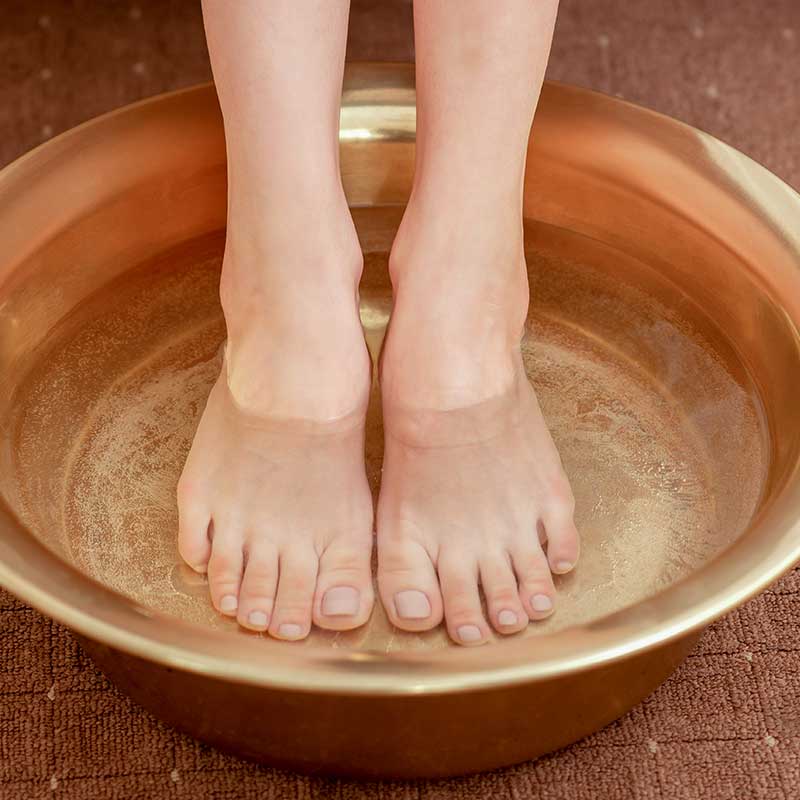 Baño terapéutico para los pies que combina agua tibia con sales, hierbas, aceites esenciales u otros ingredientes.